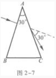 [问答题]如图2-7所示,三棱镜ABC,∠A=30°。光线垂直AB面射入棱镜,由AC面射出。已知出射光与入射光的夹角为30°。在AC面上光线的入射角是 ,棱镜的折射率是______。